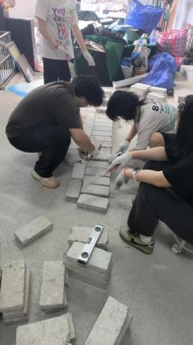 告别木屑,同学们转眼扎进泥浆堆,化身“小小泥瓦匠”。“左手托砖,右手抹浆,砖缝要像排队的士兵一样齐!”在向南老师的示范下,同学们了解了多种砌砖方法:三顺一丁、一顺一丁、梅花丁、空心砖等等,以及砌砖的基本步骤:抄平、放线、摆砖样、立皮数杆、挂线、铺灰砌砖。随后,同学们便握着灰刀开始有模有样地干了起来。