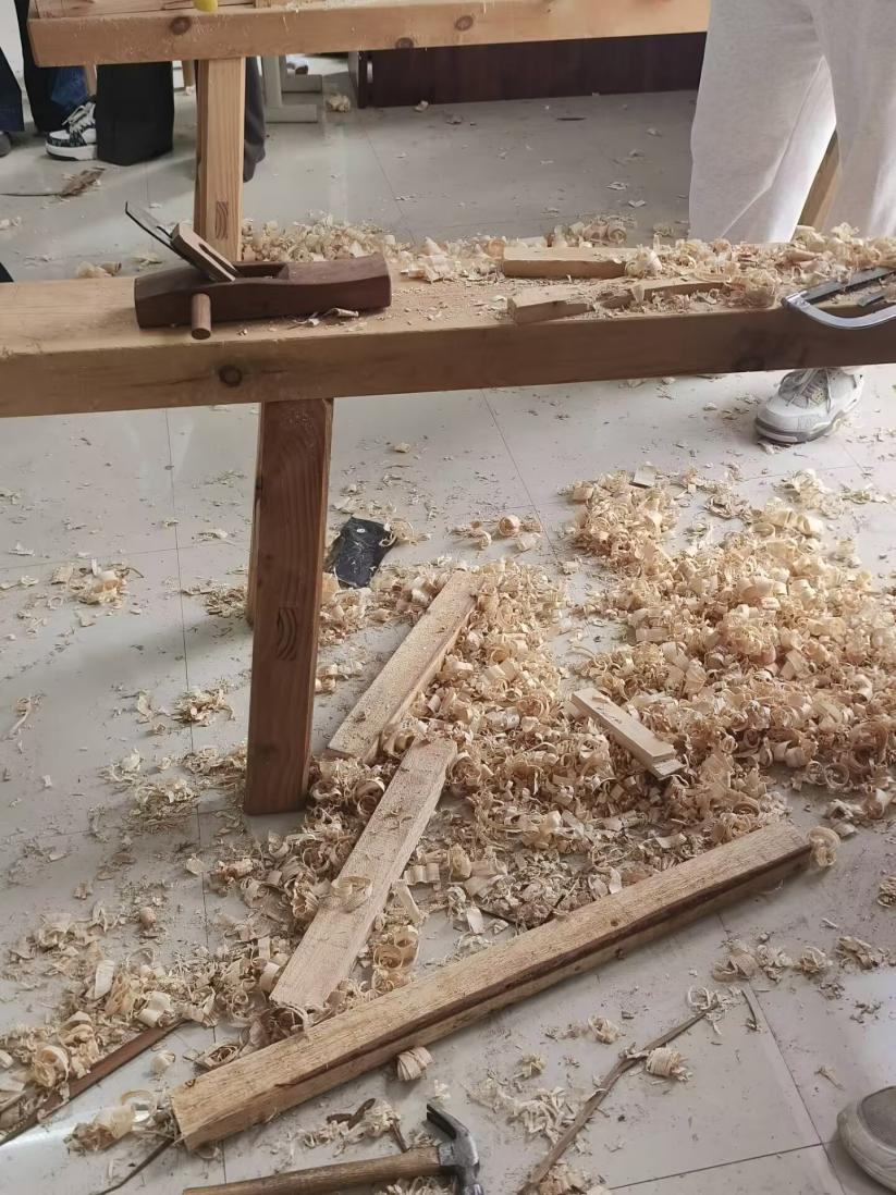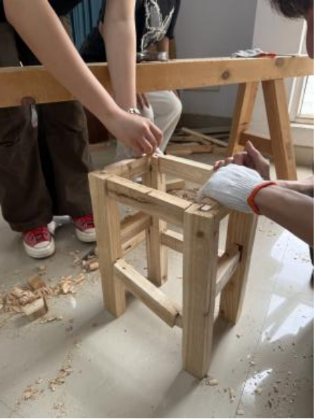 锯木“沙沙”声,锤子“DuangDuang”声,见证着同学们的努力。有小组为了打磨出光滑的凳面,用刨子反复刨光;有同学举着榫卯结构研究半天,和队友边试装边感叹“做一个严丝合缝的榫卯结构太不容易了”!从选料到组装,原本生硬的木板在敲敲打打中,木凳已经初见雏形。