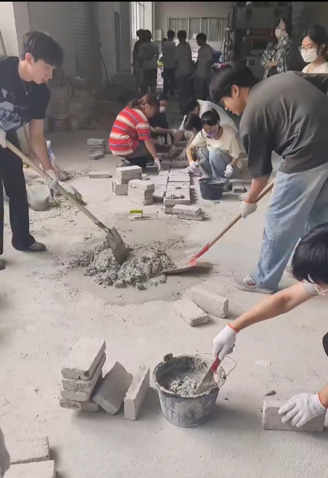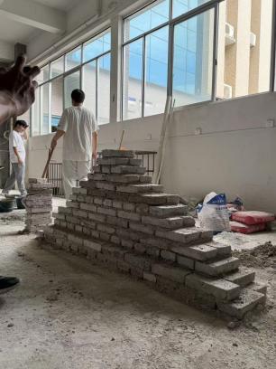 起初,砖柱会摞歪成“波浪墙”。而又一次的砌墙练习,掌握了基本要领的同学们,都砌出了完美的竖直的墙体。