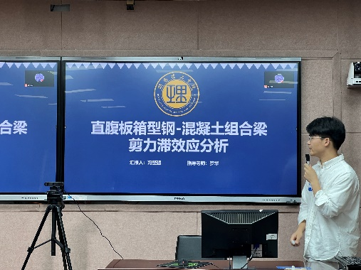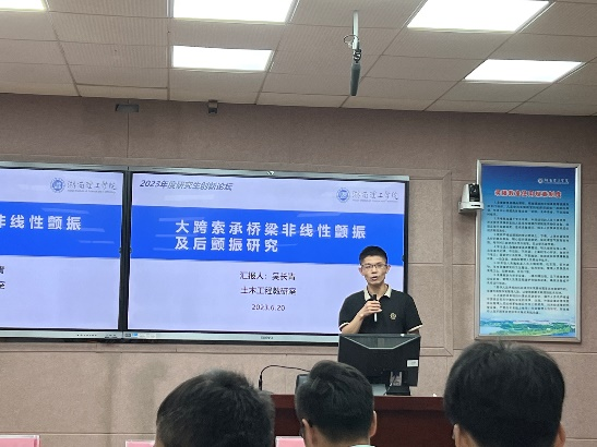 随后,潘仁胜博士与吴长青博士分别就“预制拼装UHPC 桥梁键齿接缝直剪性能研究”及“大跨度桥梁非线性颤振及后颤振研究”开展演讲,具体分析结构UHPC材料直剪性能、一体化气动时域模型等一系列研究内容。最后,员工抽签上台依次进行学术汇报,在接受评委点评及打分后得出成绩与最终获奖名次。