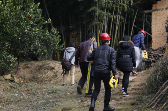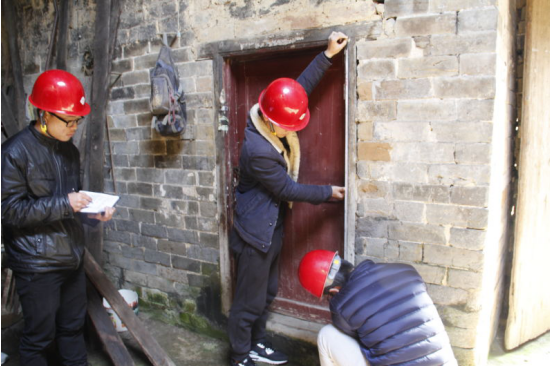 为了有更多时间进行测绘,团队一行人早早起来便驱车前往大糙村。戴上安全帽,支起三角支柱,安上水准仪,拿起皮尺,大家便开始了危房测绘工作。危房的经纬度、裂缝的宽度高度、危房的结构如何?……这是团队到来这里的调研的基础。如何在原有的基础上改造危房,使其转危为安,适合村民居住,以团队的技术为大家服务,则是团队的最终目的。虽然来回的路很是崎岖,虽然村民语言有些难懂,虽然遇到各种困难……但这些问题都被一一克服,在老师的指导下,在大家彼此配合下,在村民们热情的陪同下,这次调研完成得很顺利。