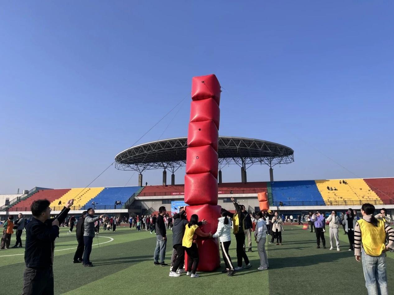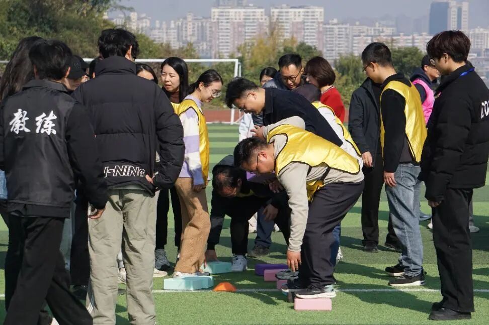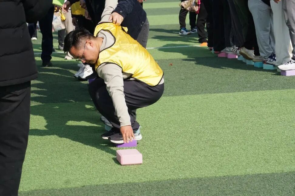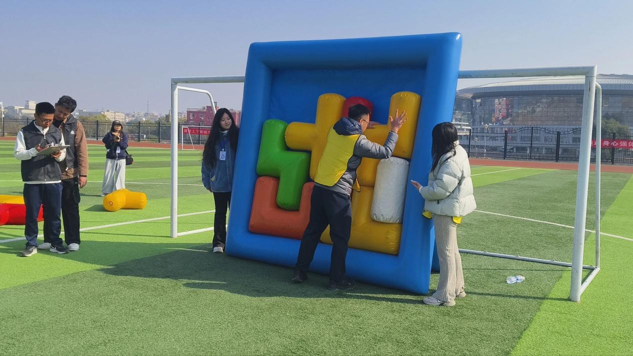 “俄罗斯方块”是一场趣味十足的拼图较量。一名老师坐镇终点担任“拼图手”,根据方块图案统筹布局;其余老师化身“零件输送员”,依次冲刺上前递送方块。众人默契配合、快速调整,从有序递送到完整拼接,尽显教职工的快速反应能力与团队协作默契。