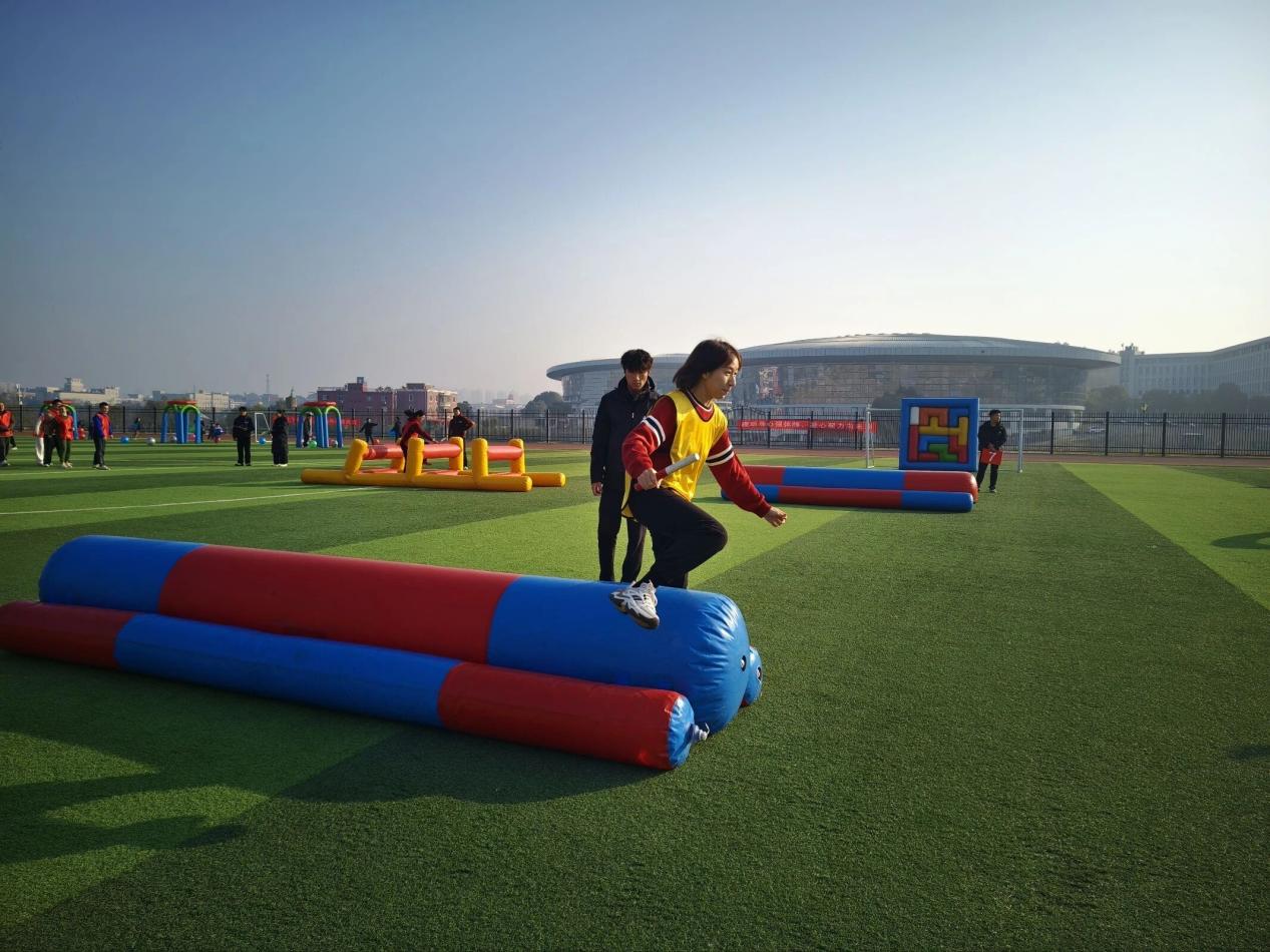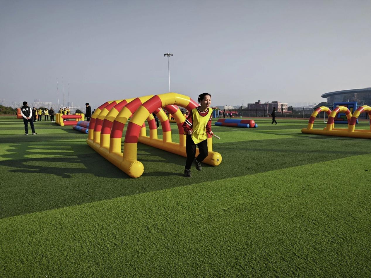 “智勇大冲关”赛道上,跨栏、平衡气垫、弧形通道等多重障碍依次排开,选手需以接力形式完成全程。起跑声落,首棒老师飞速冲刺,灵活越栏、平稳过垫、俯身钻网,随后精准将接力棒传递给下一位队员。各队配合默契,部分选手手脚并用提速闯关,现场喝彩声、呐喊声此起彼伏,每一次顺利交接都赢得阵阵欢呼。