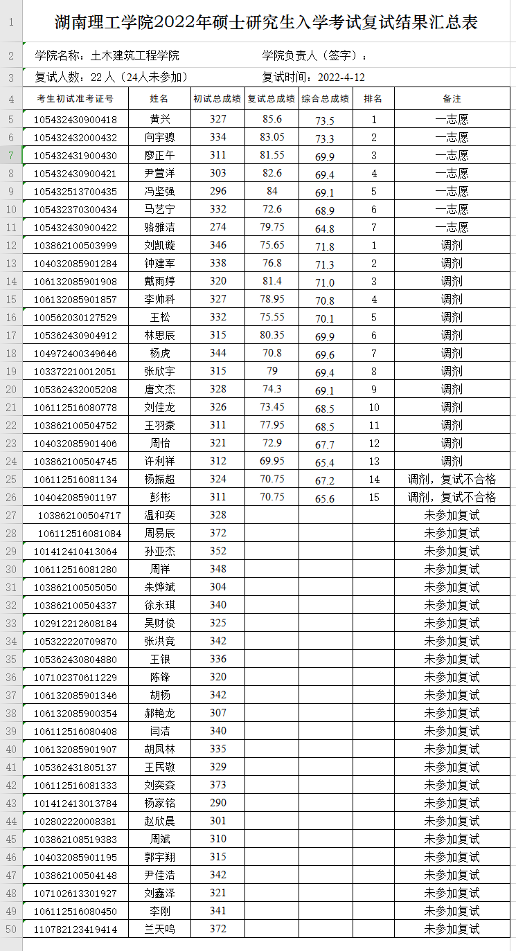 永利304官网2022年硕士研究生入学考试复试结果汇总表